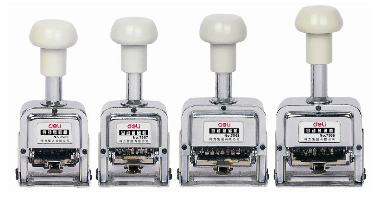 商品名称:得力自动号码机9位-7509 品牌:得力 商品毛重:500.00g 商品产地:中国大陆 类别:号码机 得力(Deli)7509-自动号码机9位 本机适用于各种票据、文件编号,操作简单,自动上墨、自动跳码,精细做工,精密构造,进位无差错 品质优良,经久耐用,避免生锈,盖印清晰;结构设计坚固,恒久使用 一 . 加油墨方法(配合使用得力7521号码机专用油墨,可有效延长号码机使用寿命) 二 . 拨号方法与7506一样(注:推动号码时,反方向是推不动的,切勿用金属棒使劲推,以免造成机子损坏) 三 . 调联键使用方法及设置与7506一样(精工制作,打号时手感轻松,跳号精准) 如:将号码调为“000201200”时,调联建不同设置的效果(操作简便快捷,自动上墨,自动跳号,自动进位)